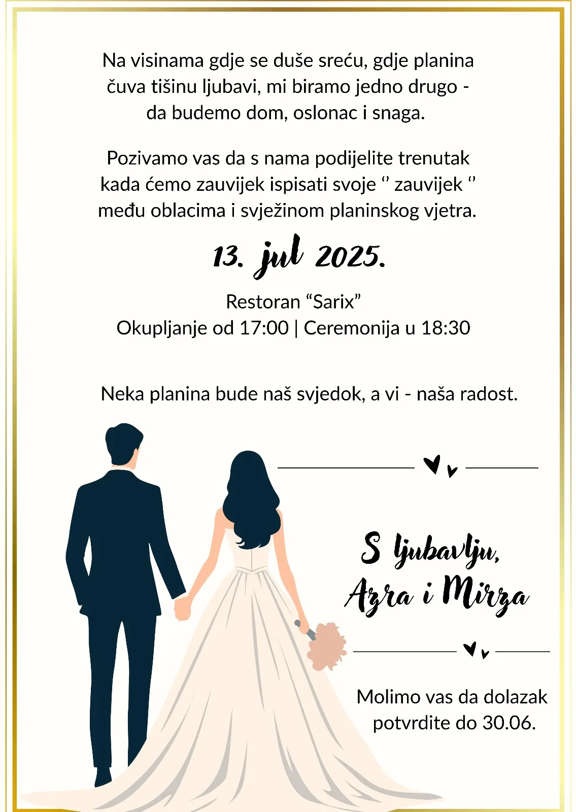 U roku od samo 24h od popunjavana formulara, naš tim će vas kontaktirati i poslati vam prvu verziju pozivnice sa vašim tekstom na pregled. Ukoliko niste zadovoljni izgledom, možete slobodno zatražiti izmjene. Ne nastavljamo sa sljedećim korakom dok ne budete 100% zadovoljni izgledom svoje pozivnice.