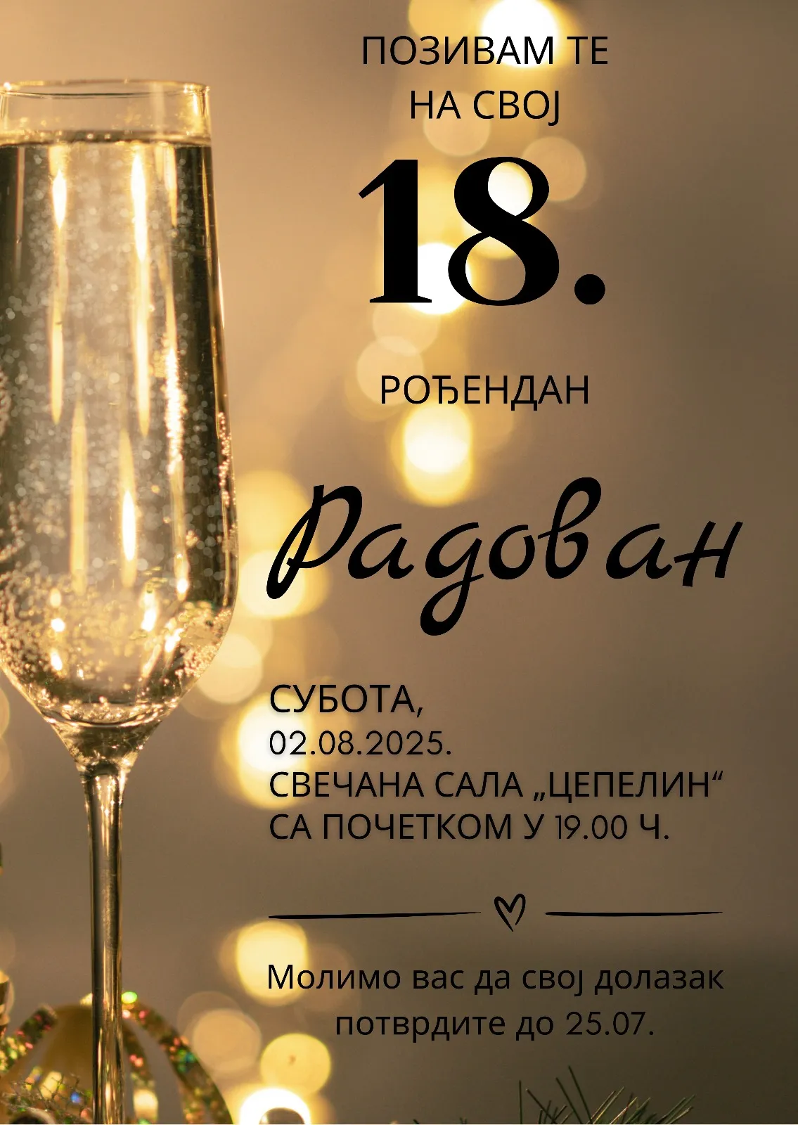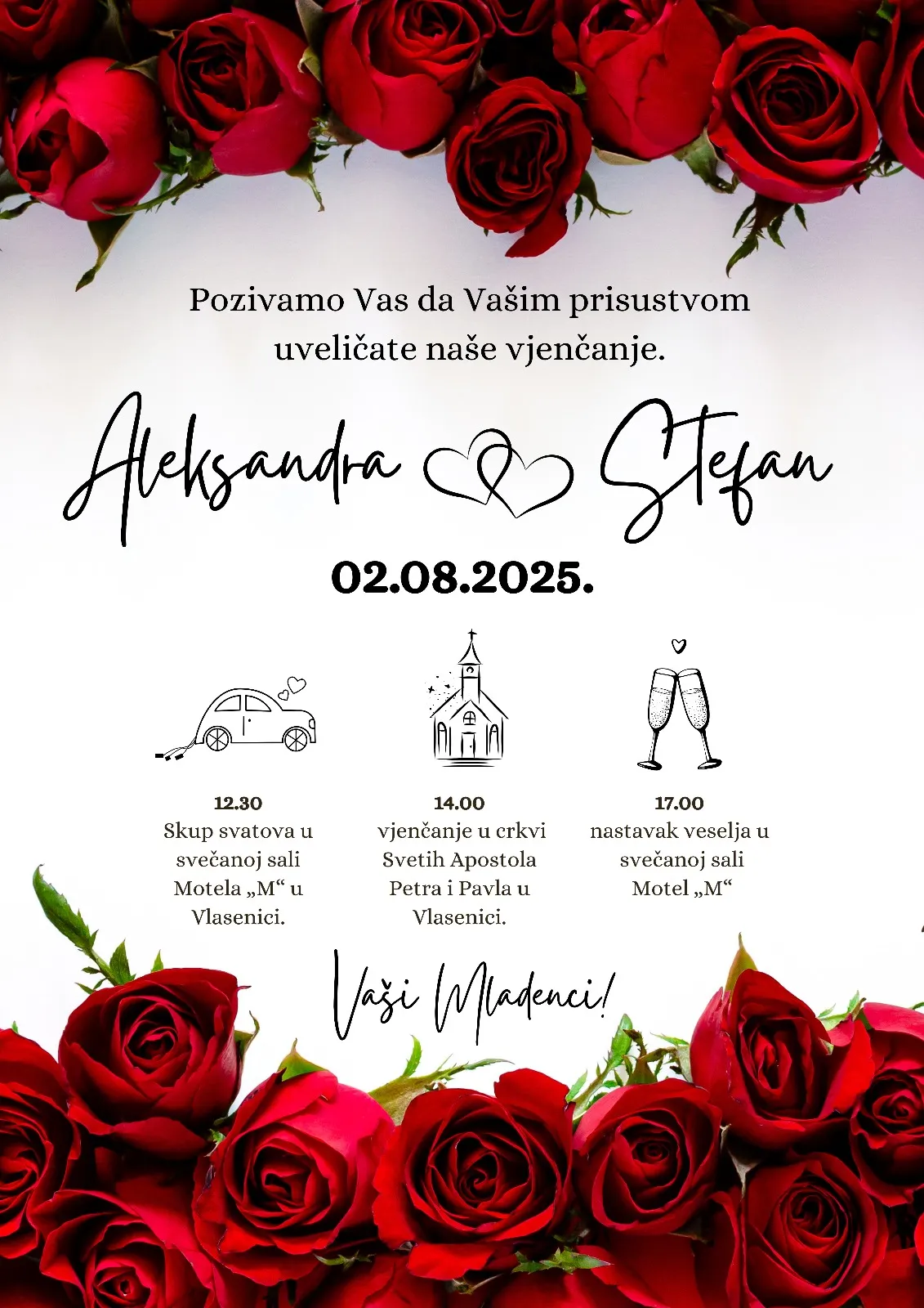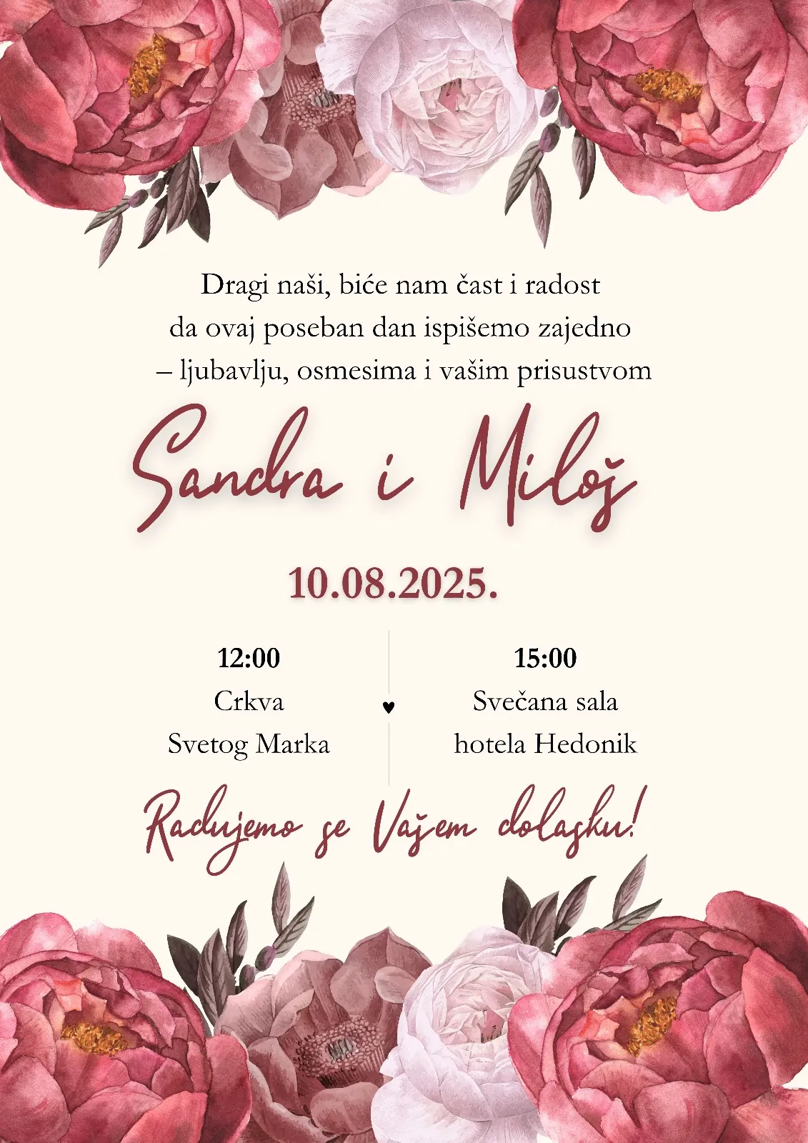 Izaberete model pozivnice koji želite, pošaljete nam Vaš tekst, izabrete da želite ćirilicu ili latinicu i koji font slova.