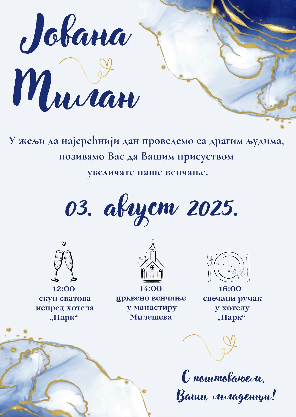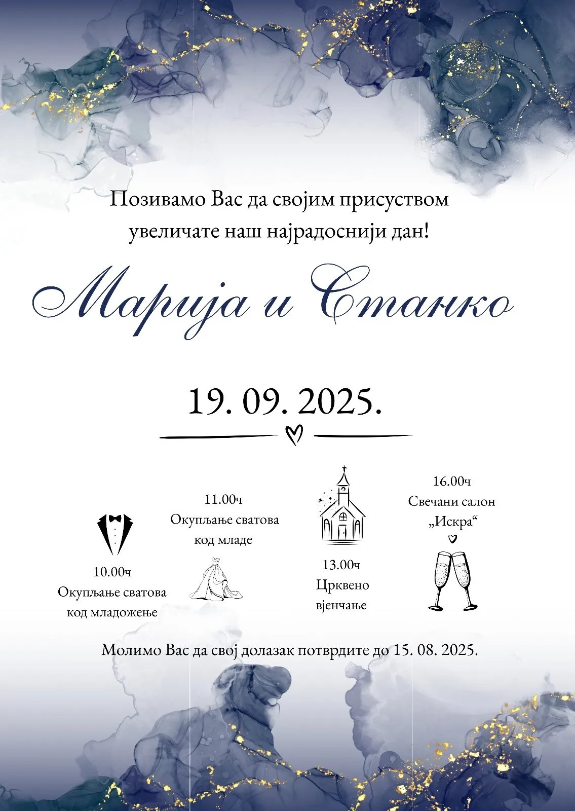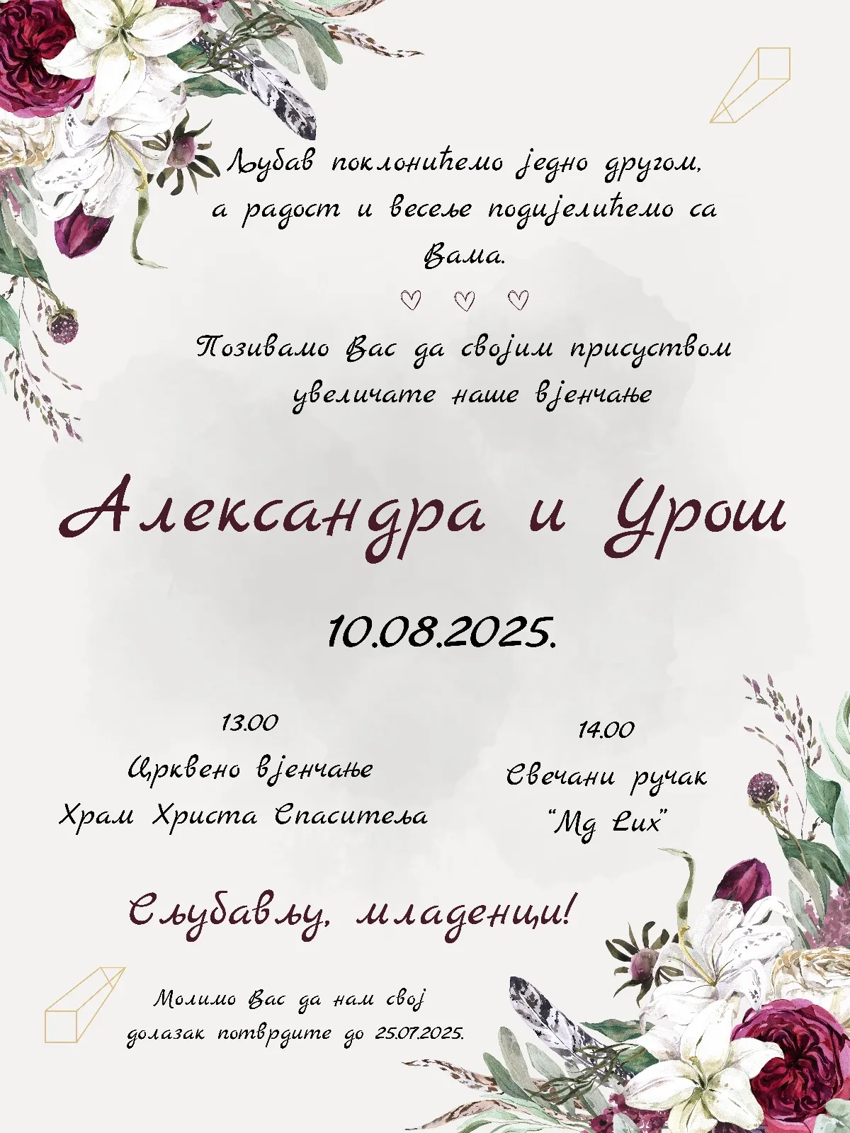 Izaberete model pozivnice koji želite, pošaljete nam Vaš tekst, izabrete da želite ćirilicu ili latinicu i koji font slova.